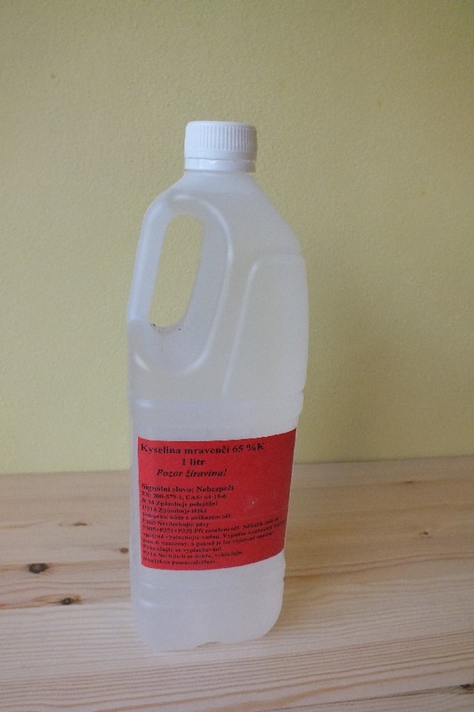 Kyselina mravenčí 65% o objemu 2 litry. Objemová hmotnost 2,6 kg.