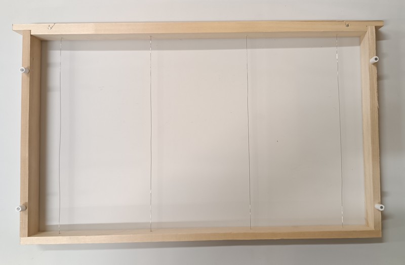 Rámek je opatřen 4 mezerníky a vypleten svisle 4 dráty.