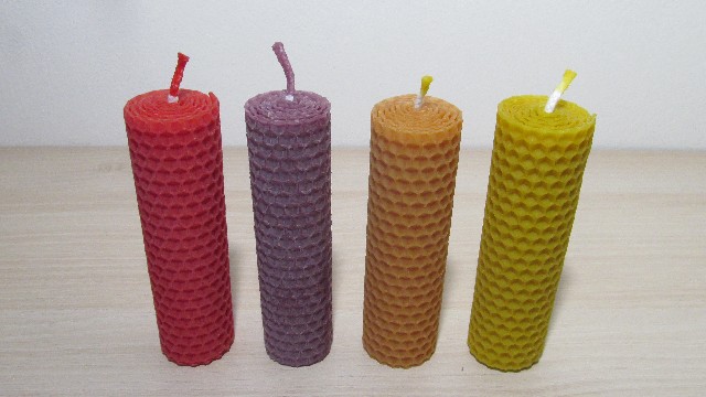Svíčky jsou vyrobeny z voskových mezistěn různých barev, kdy se mezistěna seřízne na pořadovanou velikost, přidá se knot a svíčka se umotá.